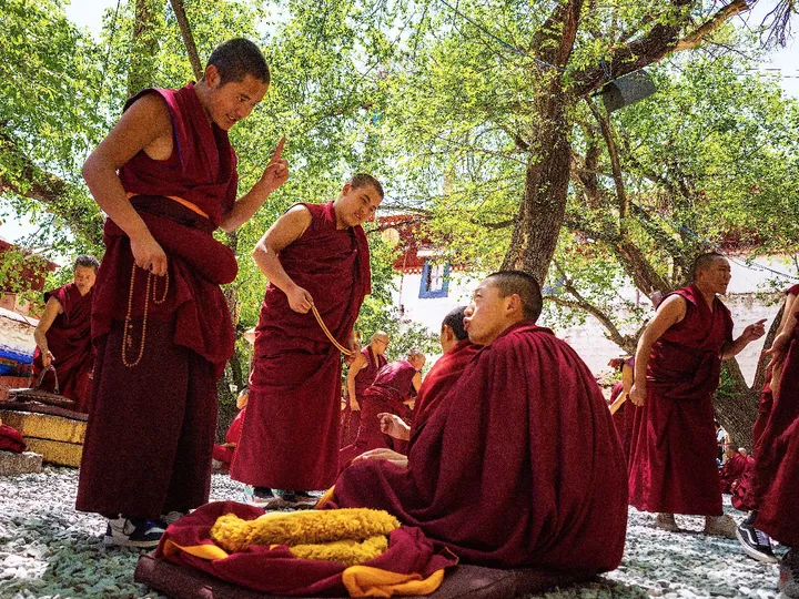喇嘛或一对一或一对多开始辩论。站立者藏语发问,席地者则藏语答辩,辩论话题涉及藏教佛学的各个方面。辩论者往往借助于各种手势来增强辩论的力度,他们或击掌催促对方尽快回答问题,或拉动佛珠表示借助佛的力量来战胜对方。
