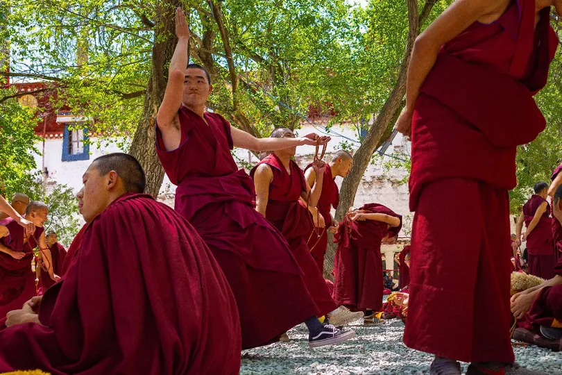 喇嘛或一对一或一对多开始辩论。站立者藏语发问,席地者则藏语答辩,辩论话题涉及藏教佛学的各个方面。辩论者往往借助于各种手势来增强辩论的力度,他们或击掌催促对方尽快回答问题,或拉动佛珠表示借助佛的力量来战胜对方。