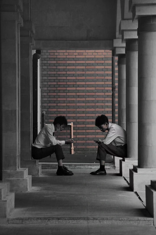 偶遇的两位男生在石柱脚上坐着休息,对称又不完全一致