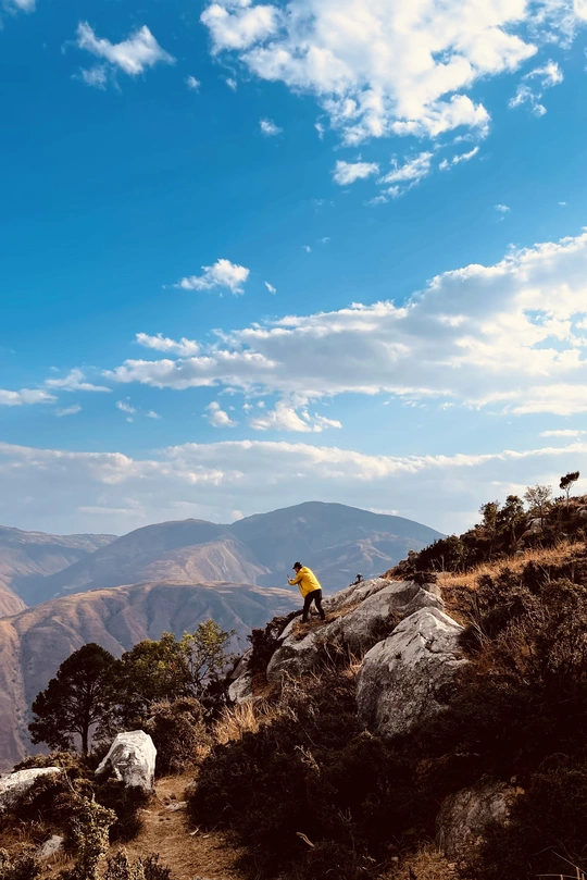 在即将到达金沙江大峡谷的路边停车拍照,父亲站在崖边去拍一颗松树,突然从他身后探出一只小黑山羊的脑袋,好奇地静静地看着父亲拍照,然后又看着我,这一瞬间立马能感受到天地之间,人与动物之间互不打扰的美好,于是用手机立刻记录下来。