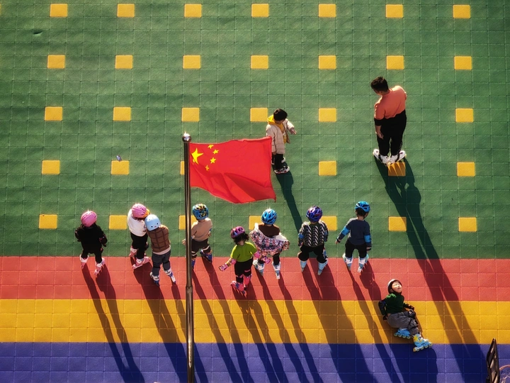 不负春光,爬楼俯拍幼儿园小朋友学滑轮。