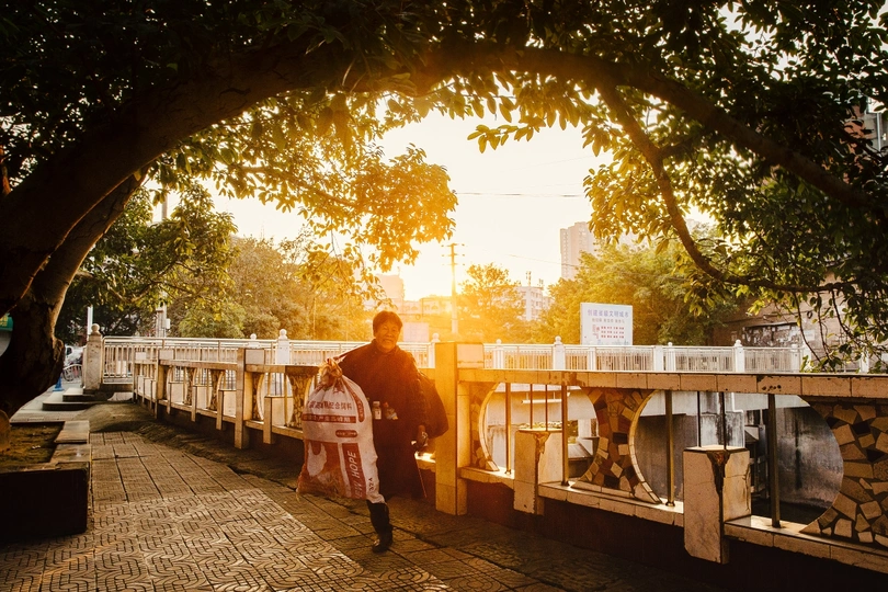 夕阳西下,黄桷树下,老人将一天的收获带回家。