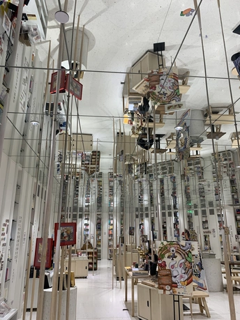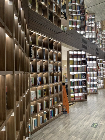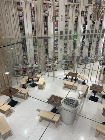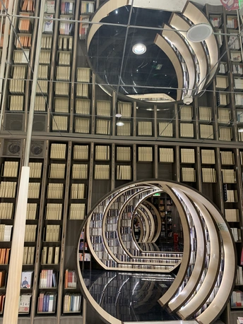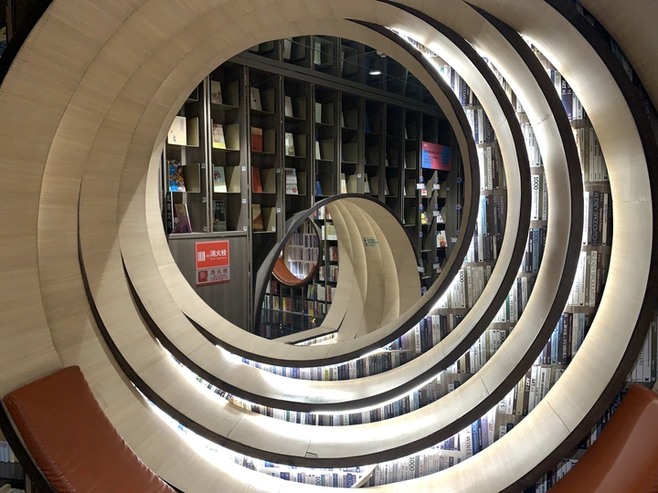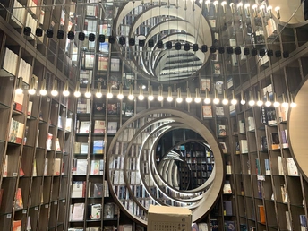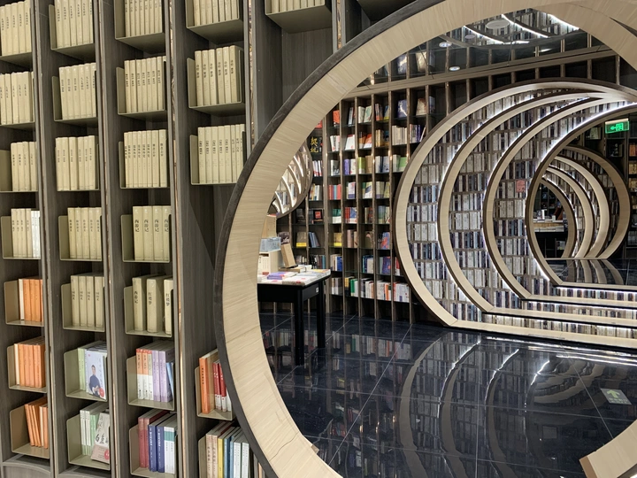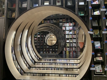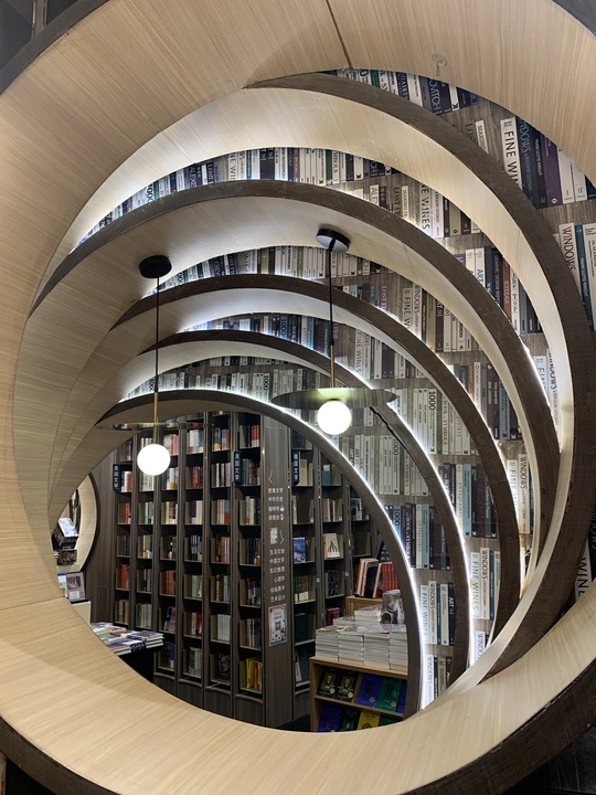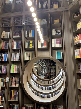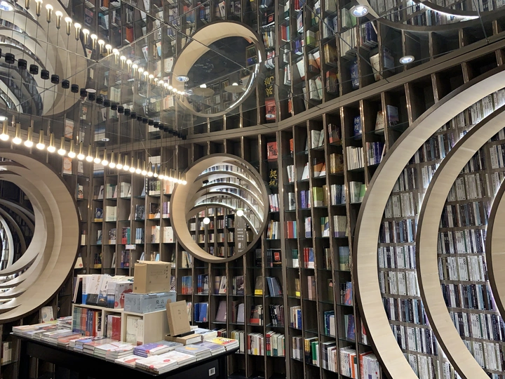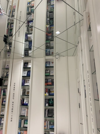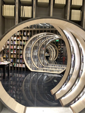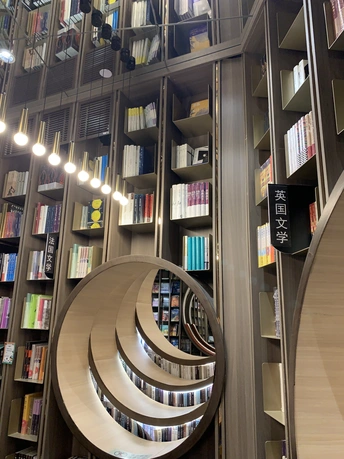 钟书阁书店室内装饰陀螺书架、镜面吊顶以及英式古典风的台灯既展现了钟书阁书店的鲜明个性,又与泰晤士小镇店的风格相呼应。据悉,钟书阁书店内运用大量玻璃元素装修,使得图书看起来更多,打造出“万花筒”式的繁花世界,尖顶配合上面的灯,则使得整个空间有种时光隧道的感觉。 钟书阁书店藏书6万余册,打造中国最美书店,治愈心灵的良药!