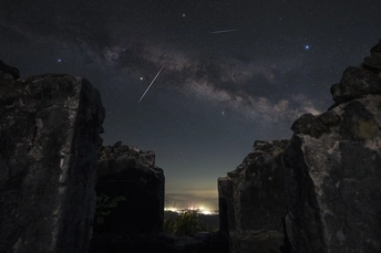 我仰望浩渺的夜空,那穿越亿万年的星光,坠落在山顶的残垣断壁间。岁月篆刻了我的沧桑,可在广袤宇宙的时间长河里,人生几十年的浮沉显得那么的渺小稚嫩,就像老去的游子回到母亲的怀里依然是个孩子。我一直坚定地相信,在满天熠熠星光中,一定有一颗是我,它炙热,璀璨,永恒地奔跑着,燃烧着… PS:最近任务繁重,没时间去寻找机位创作,偶然翻开硬盘的原数据,觉得这一张还过得去,索性修一下,过把瘾 @米拍 @米拍编少
