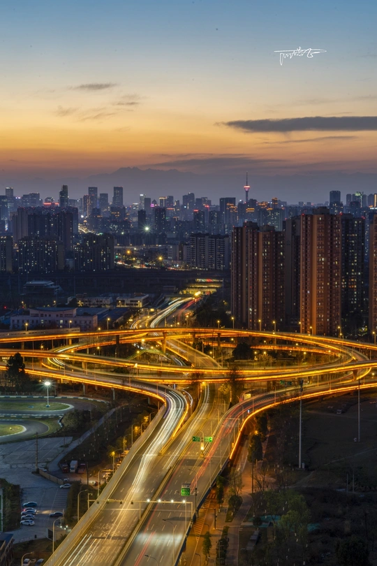 雨过天晴后的成都,太阳在西方连绵的群峰间投射出最后一缕红霞。华灯初上,钢铁森林发出炫目的光彩。