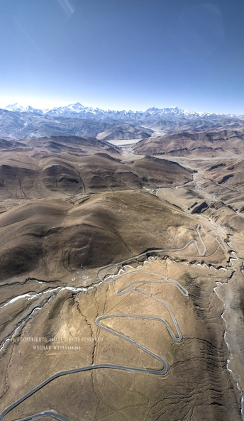 行驶到108拐嘉措拉山口,起飞无人机,一定高度时拍摄5张全景接片,脚下的路蜿蜒曲折,远处的雪山雄伟壮观