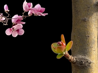 修图练习:偶发奇想,把盛开的紫玉兰花和西府海棠的芽儿做在一张片子上了。仔细一看,光照的方向不一致,穿帮了。