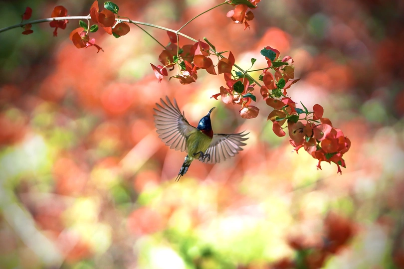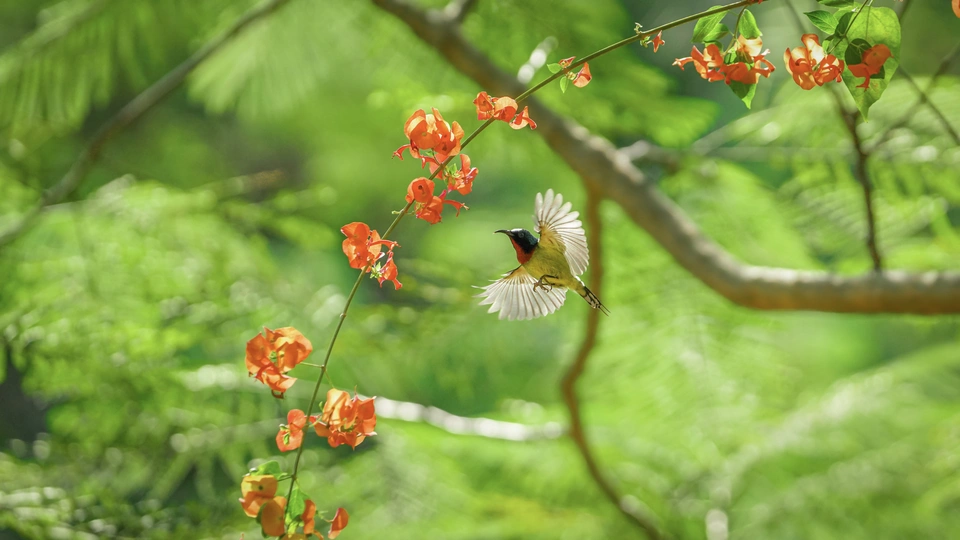 春天是绿色和红色的世界,太阳鸟在林间觅食,它们穿行在树林间和花丛里,像精灵一样灵动美丽
