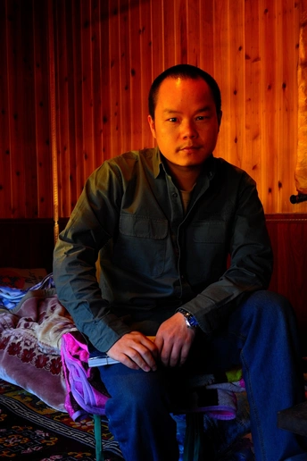 上午,阳光照在外面大殿的金顶上,反射到房间,墙壁上一片混乱的金黄色,很有意思。但是窗户上的帘子,总会挡住里面的一半光,房间里只要是看书烧茶都要开灯。只能开高感低速,坐在灯下面,再➕三脚架,才能看得有点清楚,摆弄好久定时自拍,才拍了几张。