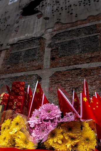 国庆节首日,上海四行仓库下人们自发举行的祭拜先烈