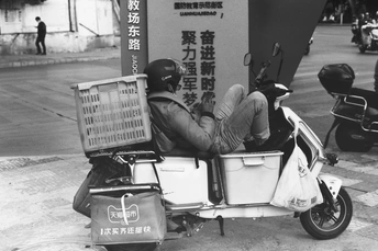 在路口遇到正躺在车上休息的快递员。