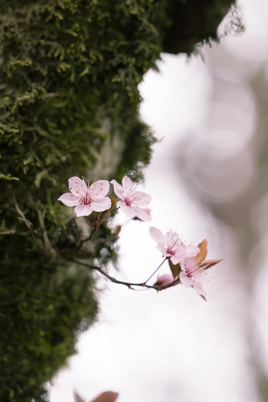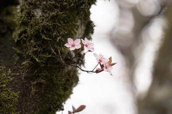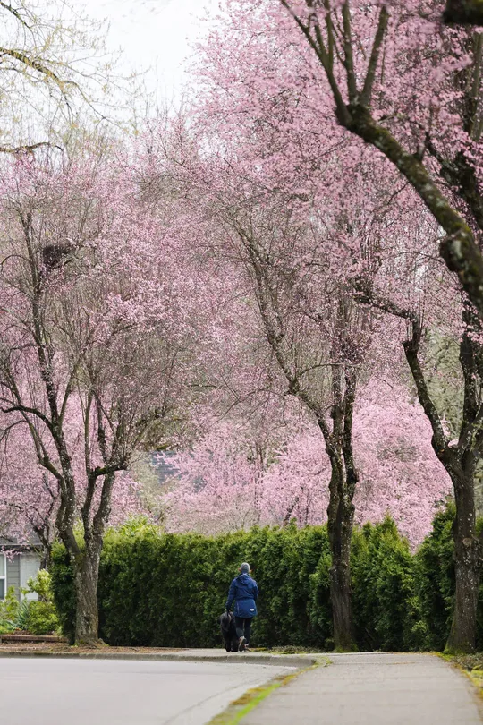 春天到了,樱花开了。常年下雨的气候,樱花树上会长苔藓。