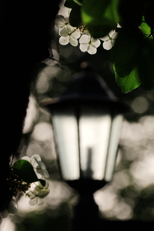 透过正午的阳光,琼花瓣和路灯罩光影诱人。