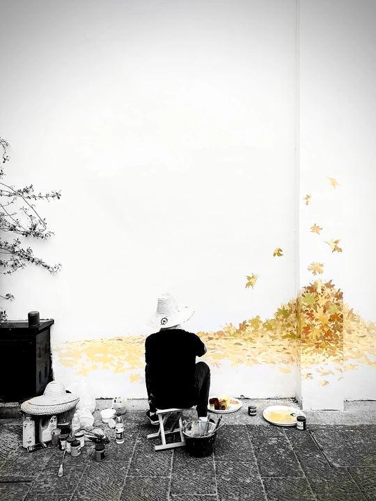 画家像一个老农一样,把画笔、颜料、调色盘一一从蛇皮口袋里拿出来,然后调和颜料,蘸笔作画。也许对他来说,画画如同一般生活,不需要所谓“艺术”来矫饰。