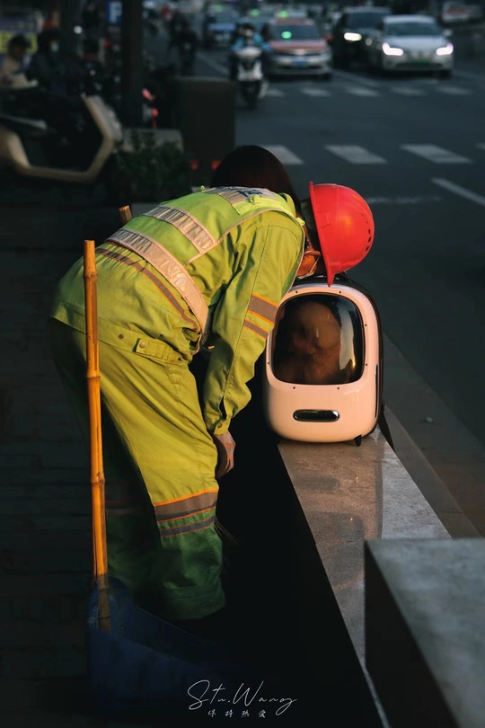 路边的清洁工阿姨看到可爱的小狗忍不住上前打招呼,再辛苦的生活也要有记得找到快乐啊