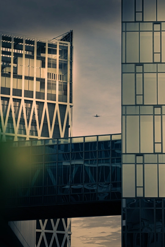 高楼耸立,阳光照耀其表面,让它们显得更加壮观。而在楼间空隙里,一架飞机远远地出现在天空中。在这个喧嚣的城市中,这幅画面仿佛在提醒人们:生活依然美好,不妨抬头看看。