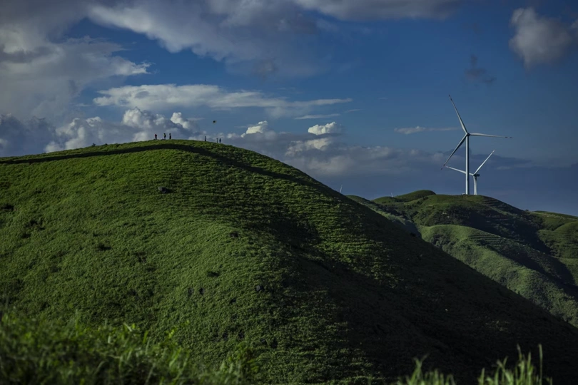 罗霄山脉上,风车不紧不慢的转动着,白云在蓝天上悠悠的飘动,是谁握着风筝的线