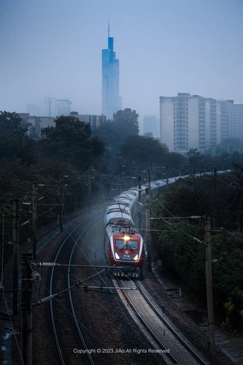 火车与远处紫峰大厦的同框,在阴雨天,紫峰大厦被云雾笼罩着,别有一番意境