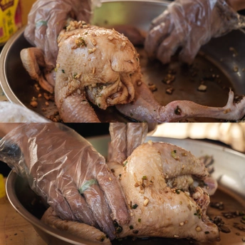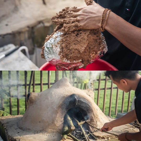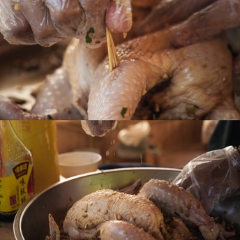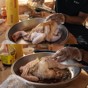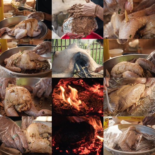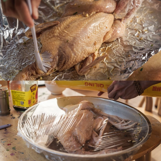 吃鸡不?自己动手做的是不是更香呢? ①把鸡掏洗干净; ②撒上葱蒜和调味酱油; ③戴上手套将调味料均匀涂抹在鸡全身; ④用消过毒的针或牙签在鸡上多扎小孔(为了让鸡肉更入味); ⑤均匀撒盐和涂蜜糖,然后继续均匀涂抹并把多余的葱蒜塞进鸡体内; ⑥放入盘中覆盖层保鲜膜腌制半小时(30min)左右; ⑦用锡纸完全包裹整只鸡,然后用混了水的泥土全面覆盖锡纸; ⑧放入土窑炉里烤一个小时(1h)左右; ⑨可以取出品尝美味了(取出时注意戴隔热手套或垫布!)