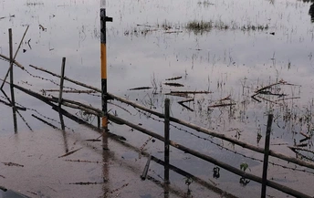 去年台风过后的农田,积满了及膝的水,靠近鱼塘的,还有鱼抓。看到此景,你绝对不会想到,不远处正抓鱼地热闹。