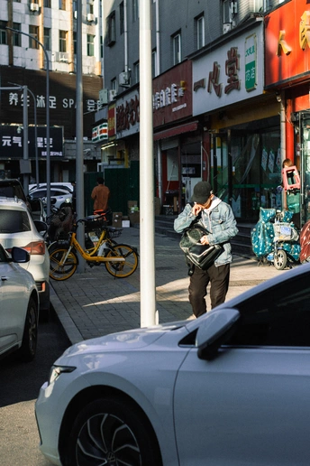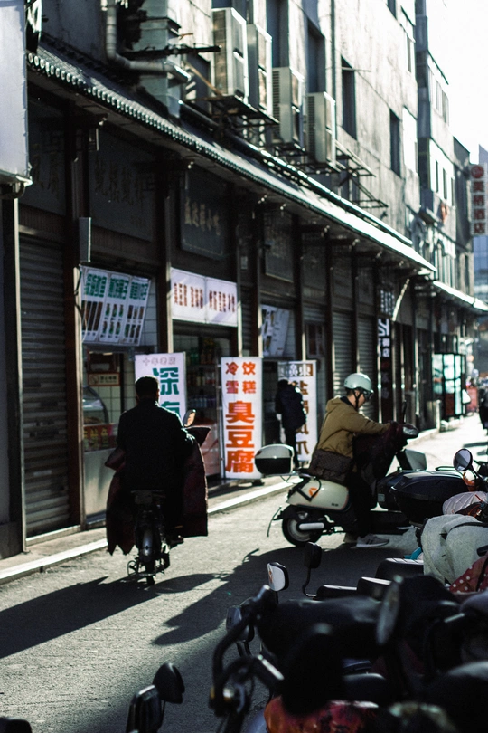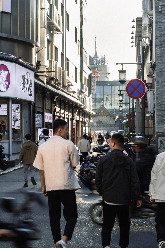 这次扫街是刚刚入春的一个周一拍的,给自己定了个路线,就沿马路去搜寻那些画面。路线中有一段是经过我们这里的步行街,大周一人也不少。我是个不爱逛街的人,猛地一下来到人多的地方,听着耳机里面快节奏的歌,眼睛搜索看到的画面,就不免有些眩晕,感觉人潮像水一样朝自己涌过来,太阳下山的时候走到人少一些的巷子,那种眩晕感也就消失了。