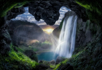国内比较还算满意的一处瀑布,由于危险道路被全面封锁,门卫只给了十几分钟的拍摄窗口期。阳光照射下的瀑布散射出肉眼可见的斑斓彩虹,我与通行摄影好友为此美景感到惊叹。由于洞口比较大,20张接片曝光后形成一个心形洞穴,恰好亲吻☀️,因此取名瀑布之恋。