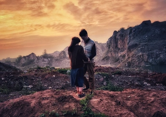 夕阳照在平静的矿坑水面上,去见证他们的美好