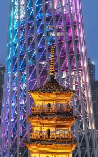 赤岗塔与广州塔同框,古与今的对比,由于赤岗塔亮灯时间比较晚,运用了时间合成,把赤岗塔亮灯后的样子与蓝调时刻融合。