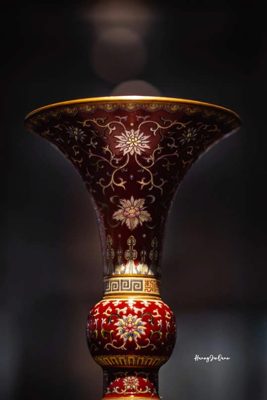 文物名称:紫地粉彩勾莲八宝纹花觚(gū) 尺寸:高28厘米,口径15.3厘米,底径12.7厘米 年代:清乾隆(1736-1795) 馆藏:广西区博物馆 粉彩花觚胎白质坚,内壁和外底施了松石绿釉,外壁以紫地粉彩绘图,粉彩的主题纹饰是“勾莲托宝”纹。觚的口沿、颈根、胫部、座边都用金彩弦纹描绘,口边粉彩绘如意纹,颈部纹饰上下依次为勾连托杂宝、蕉叶纹,器座纹饰由上而下如意纹、托杂宝纹、菊花四出蔓茎纹,这与花觚上半部的纹饰相对应。底是黄釉地篆书“大清乾隆年制”款。 觚盛行于商周时期,是一种饮酒器,但这件高28cm的精致粉彩花觚显然不能作为酒杯使用,它应是作为礼器使用。 此花觚的绘制精湛,粉彩温润柔和,纹饰寓意吉祥,造型工艺更是精益求精,尽显出乾隆盛世粉彩瓷器的繁缛奢华。 ---- 【广西壮族自治区博物馆】 一楼:文创商店、青少年活动中心、历史小剧场、儿童考古探秘馆 二楼:广西古代文明陈列、馆藏瓷器精品陈列、馆藏历代工艺珍品陈列 三楼:广西汉代海上丝绸之路