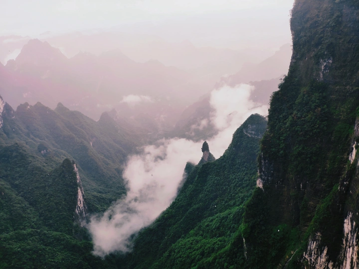 站在天门山的鬼谷栈道上眺望,前面的一座小山像一尊佛像,四周雾气环绕,如佛祖显灵,眺望群山。空气清新,心旷神怡。