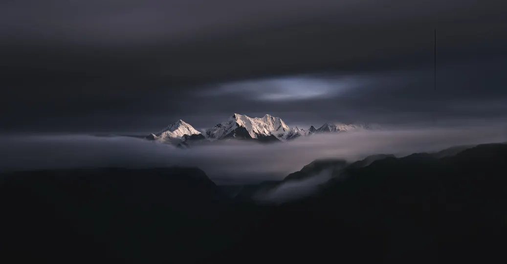 这是我对大自然的崇敬。我通过延时摄影拍摄了这组图像,然后进行时间合成与堆栈。这件艺术品包含了这座雄伟雪山的秘境和孤独。在这个时刻完成这项创作也是一个艰难的夜晚!