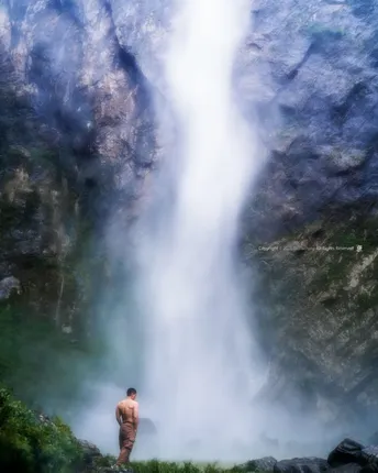 最初我是非常想拍一次瀑布,后来得知这个地方,上午下过大雨,约摄友大家都不愿意去,所以我选择只身前往,我骑了接近了两个小时的单车,再下车徒步一小时进入到深山,抵达瀑布之后,我大为震撼,流水从百米高山流下,水流落地产生的气流快让我站不稳了,我架稳机位,自己走过去与瀑布留下了这张合影,由于拍摄环境比较恶劣,所以都没有拍很多张。