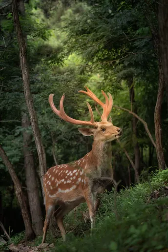 拍摄地点:大连白云山 拍摄器材:索尼A7R3+24-105F4 一只梅花鹿在森林中觅食