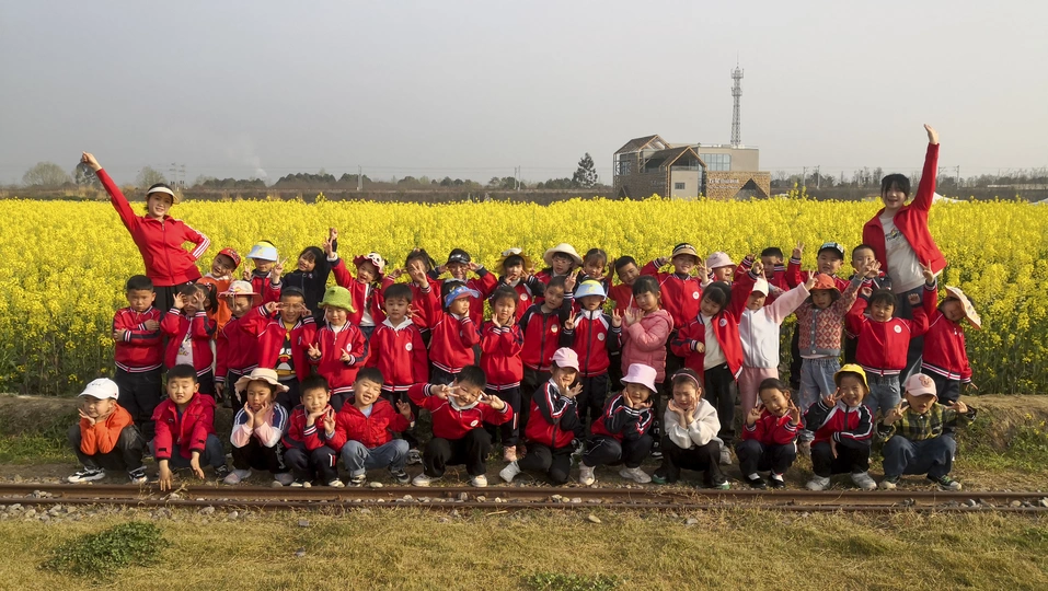 油菜花开季,崇州市白头镇幼儿园的老师带着孩子们春游。
