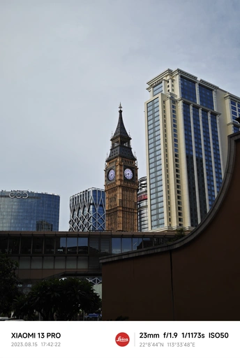 中世纪的钟楼与背后的现代建筑形成强烈的反差感