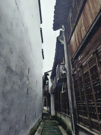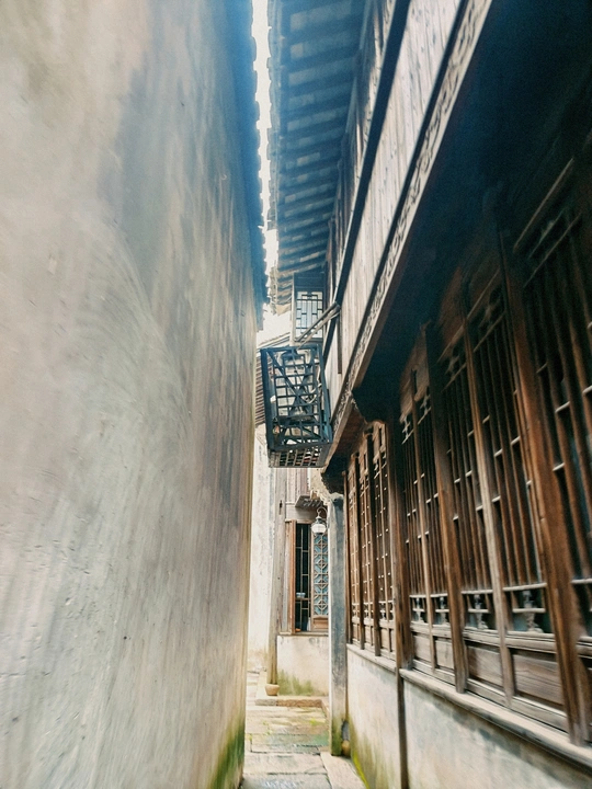一个美丽而宁静的小巷景色,古老的建筑、树木和周围的自然风景构成了一幅和谐的画面。照片的色彩柔和,光线充足,使得这个场景更加生动逼真。