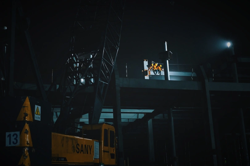 夜间施工,三个工人并排坐到钢梁上进行安装,一束探照灯打过来,像极了一个盛大的舞台。