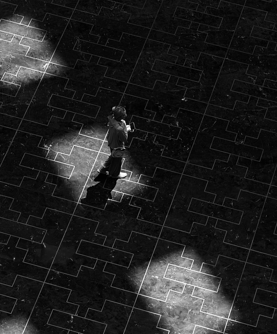 空荡荡博物馆大厅,阳光穿过天窗把这个女人照亮