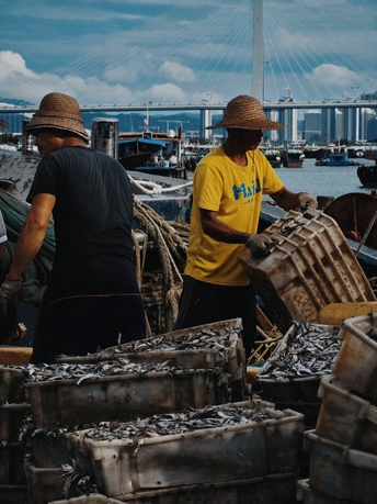 这是开渔后的洪湾渔港,装卸工在午后忙碌,他们身后不远处停泊的归港渔船,都在鱼获满满的靠岸卸货。