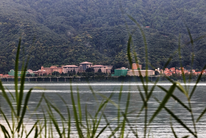 连续数天有雨,洗刷了空气,空气清新;洗涤了树叶,树叶翠绿;冲洗了湖水,湖水清冽。 画面清新,清新宁静。前景草掩,半暗半明;中景湖水,由近及远;远景建筑,依山傍水。 景深、层次不同要素构成,自然风光,人文突出;人文风景,山川秀美。空山新雨,水色山色,风景如画。