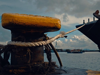 清晨的渔港,一条看起来不粗的系船绳把泊岸的渔船牢牢的牵在系船柱上,这种以小制大很是有力量感。