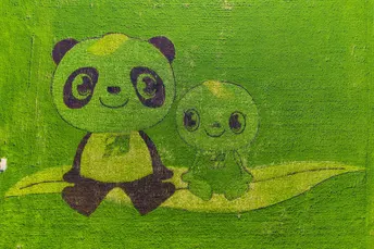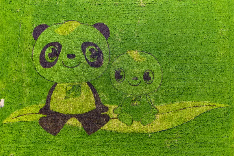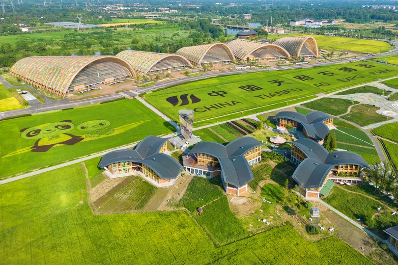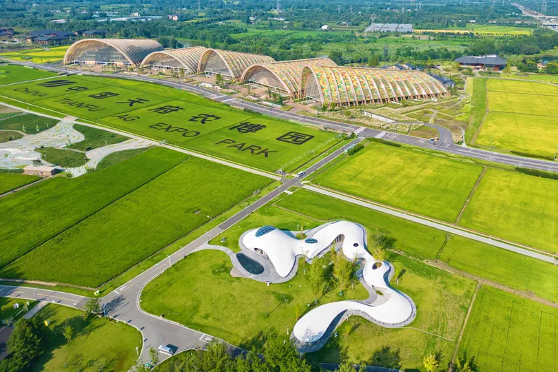 成都天府农博园,千亩绿意盎然的大田里,深紫色的“中国天府农博园”中英文logo大气醒目,传递着丰收的信号!