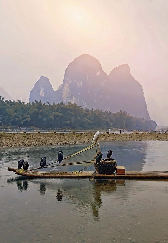 走进“诗画中国”之阳朔漓江 漓江发源于桂林市兴安县和资源县交接区域,海拔1732米的越城岭老山界南侧,全长214公里,其中100公里流经漓江景区。走进漓江,除了映入眼帘的漓江山水之外,还有漓江边的“渔翁模特”,他们把“漓江渔火”生动形象的印在了这幅山水画卷之中,他们的存在更是点燃了一代代渔家儿女生存繁衍的命脉。 在漓江边上的渔翁老爷爷,一叶竹筏一张网,两只鱼鹰一盏灯,他们的存在对于漓江山水来说是一种不可或缺的美,他们是漓江上精神文化的代表的符号,更是漓江山水不可或缺的元素。 虽然20元人民币背景中的“华中渔翁”的原型老爷爷已离世,但我觉得渔翁始是画中客,此时更是画中仙。