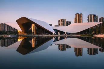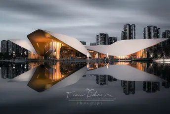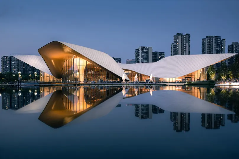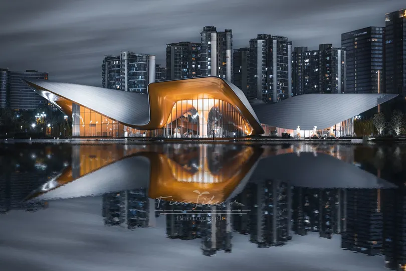 天府美术馆 从日落到傍晚,成都市天府美术馆采用“成都市花”芙蓉花造型的异形金属屋面设计,如一朵芙蓉花般亭亭玉立于湖面。 p1:天府美术馆正面,200张堆栈做明度建筑 p2:天府美术馆侧面,60张堆栈做明度建筑 p3:日落时分 p4:蓝调时刻