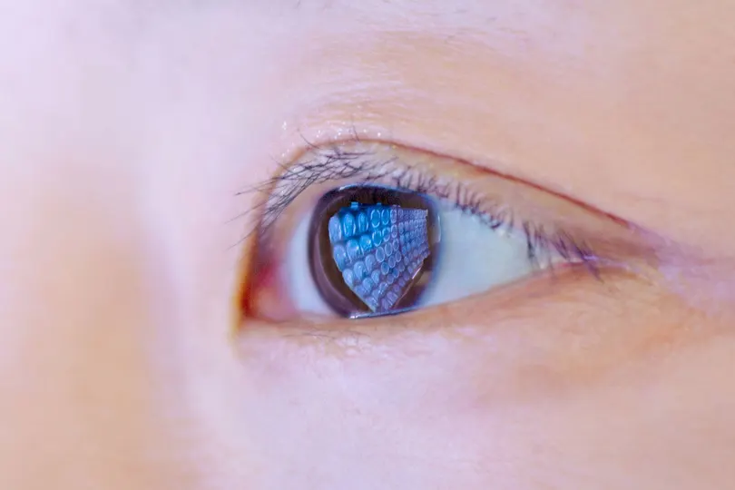 一名医务人员正在聚精会神的看片工作,眼睛里折射出X光片。