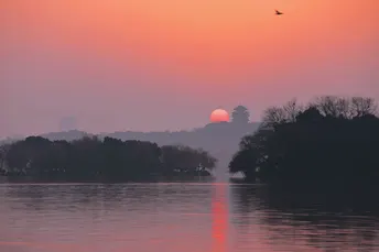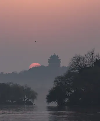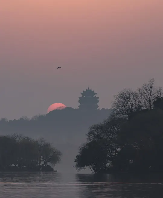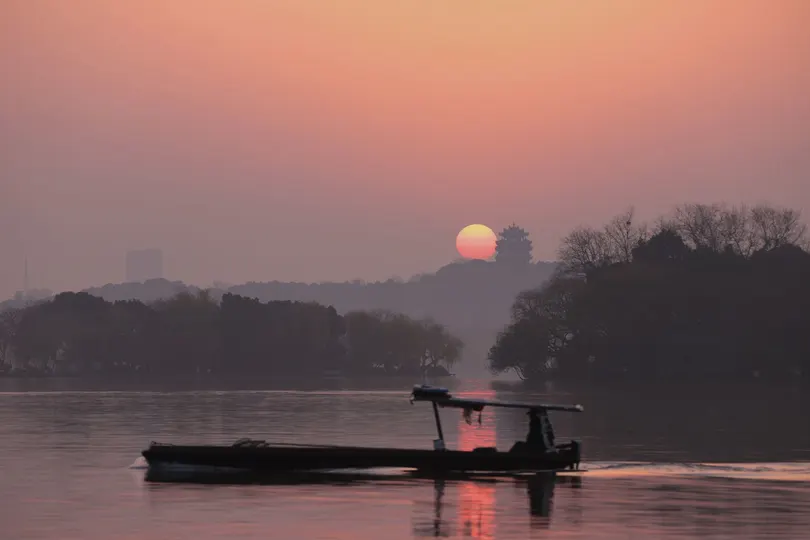 拍摄于1月初,苏堤拍摄经典机位,城隍阁日出,刚好有船经过,形成一幅美丽的画卷