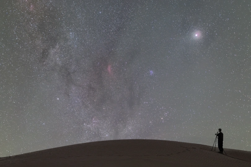 NGC 1499俗称加利福尼亚星云或加州星云(California Nebula),是位于英仙座的发射星云,距离地球约1,000光年,最初在1884年由美国天文学家巴纳德发现。它的名称来自它酷似美国加利福尼亚州的轮廓。加利福尼亚星云的视直径可达2.5°,但由于从望远镜观测得的表面亮度非常低(约14等左右),所以很难以裸眼进行目视观测,宜使用广视野望远镜,配合Hβ滤镜(波长486纳米),在低光害的夜空环境下拍摄。NGC 1499:这是一个大的弱发射星云,它被英仙座ζ的光所照亮。 NGC 1499又叫加利福利亚星云.她的形状与加利福利亚州相似,故而得此名。比昴宿星团昏暗一些,因而更加难以辨认。这团红色的,正在膨胀的氢气距离我们约1,500光年。这片漂浮在银河系猎户座旋臂(猎户臂)上的宇宙云,碰巧与美国西海岸加利福尼亚州的轮廓相似。我们自己的太阳也位于银河系的猎户臂内,距离加州星云仅1500光年。这片典型的发射星云也被称为NGC1499,长度大约为100光年。加州星云闪耀着红色的光芒,这是氢原子与丢失已久的电子重新结合的特征。电子被高能星光剥离和电离。这片星云是天体摄影师的热门目标。