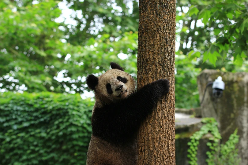 成都大熊猫繁育研究基地,一只大熊猫正在爬树,发现我正在拍照,就停下来让我拍个够!