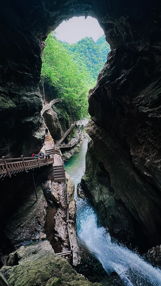 作品拍摄于湖北神农架天生桥景区,激流的瀑布与远处的山洞形成呼应,木架桥将两个元素结合在一起,造就了一副别有洞天的画作。