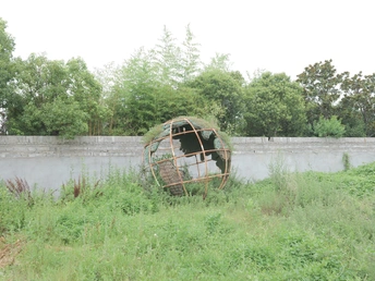 一个景区周边废弃的地球状装饰品,上面停留了一只鸟,好似世界末日